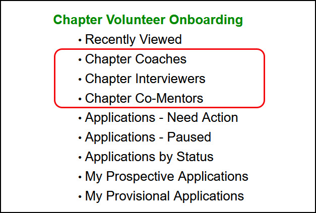 - From the Engage homepage, locate Chapter Coaches, Chapter Interviewers, or Chapter Co-Mentors and select one to open the list.