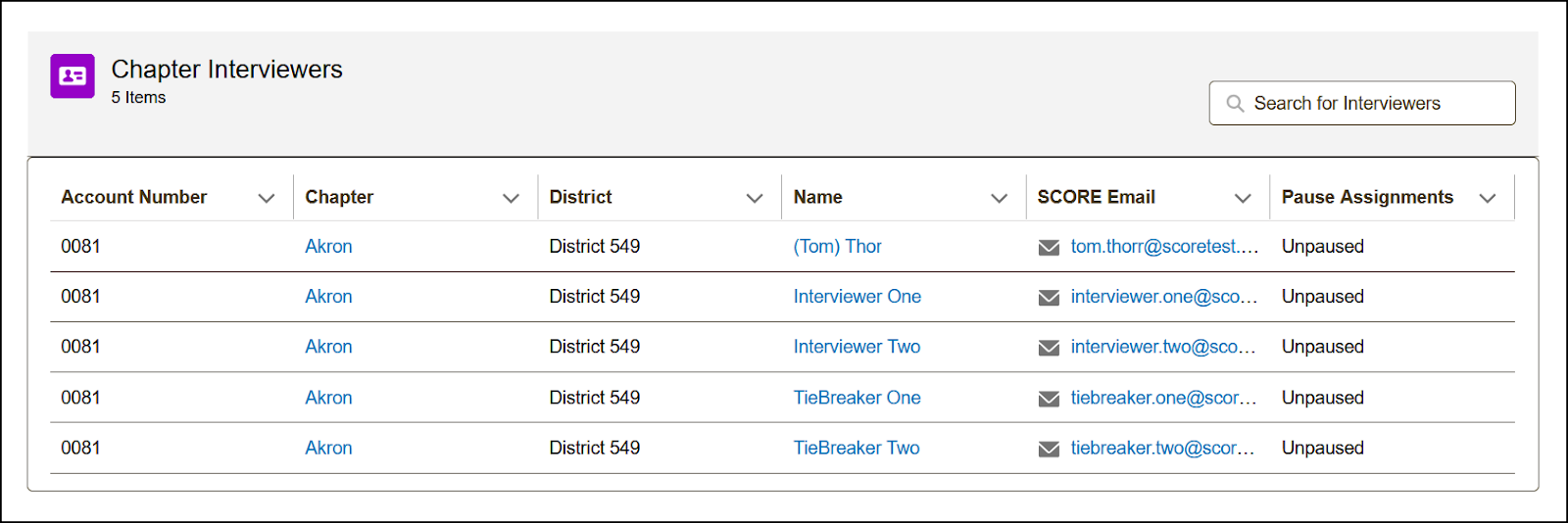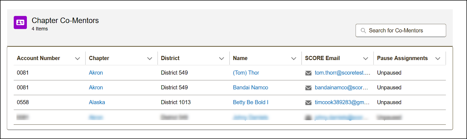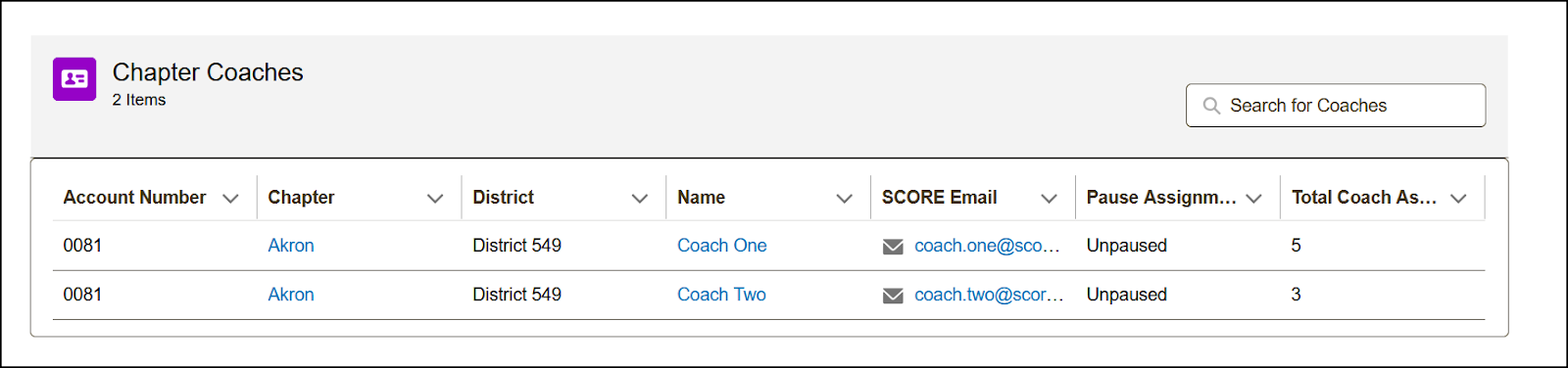 - Once the list is open, you’ll see key details such as the account number (chapter number), chapter (shows the affiliation (account name), contact name, SCORE email, pause mentoring status, and for the Chapter Coaches list, it will show the total number of coach assignments.