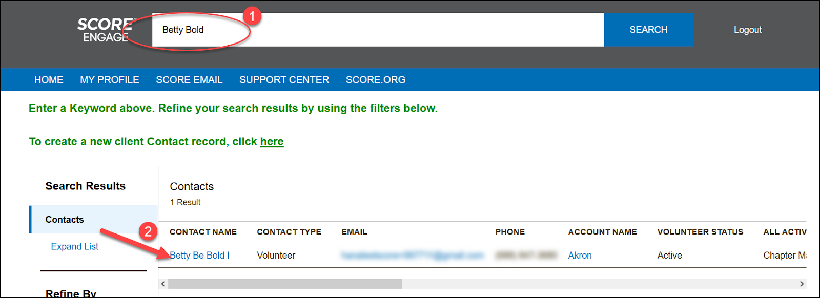 - In the search results, click the volunteer’s name under the Contact Name column to open their profile page.