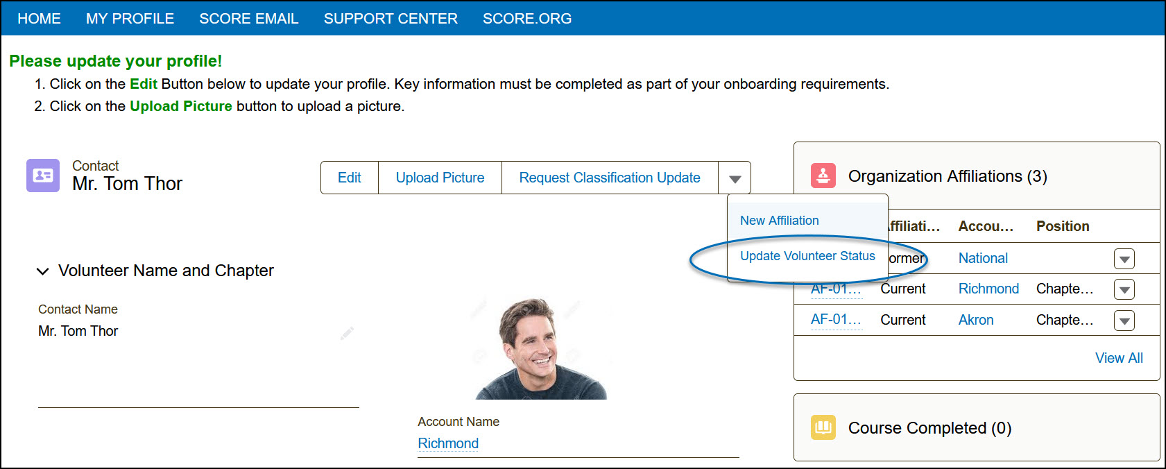 It is important for all SCORE volunteers to maintain an accurate status. A status can be applied to a volunteer’s record automatically by the system based on certain triggers or it can be updated manually. To help SCORE maintain accurate information, there is an annual requirement for each volunteer to review their status.