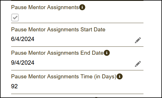 - Pause Mentor Assignments: The checkbox is no longer clickable. The checkbox selection and deselection are now triggered by the start date and end date fields.