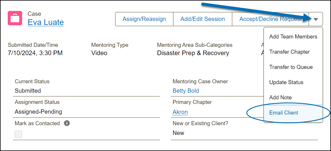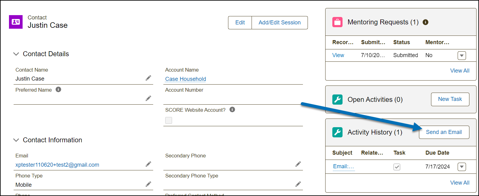 2) When looking at the client's contact record page, locate the "Activity History" in the related list and click the "Send an Email" button.
