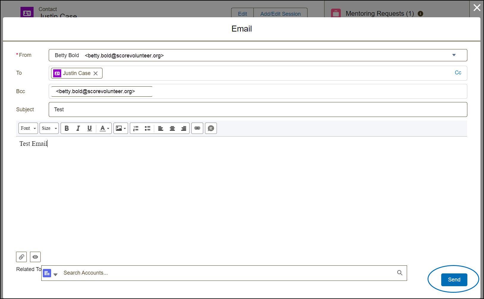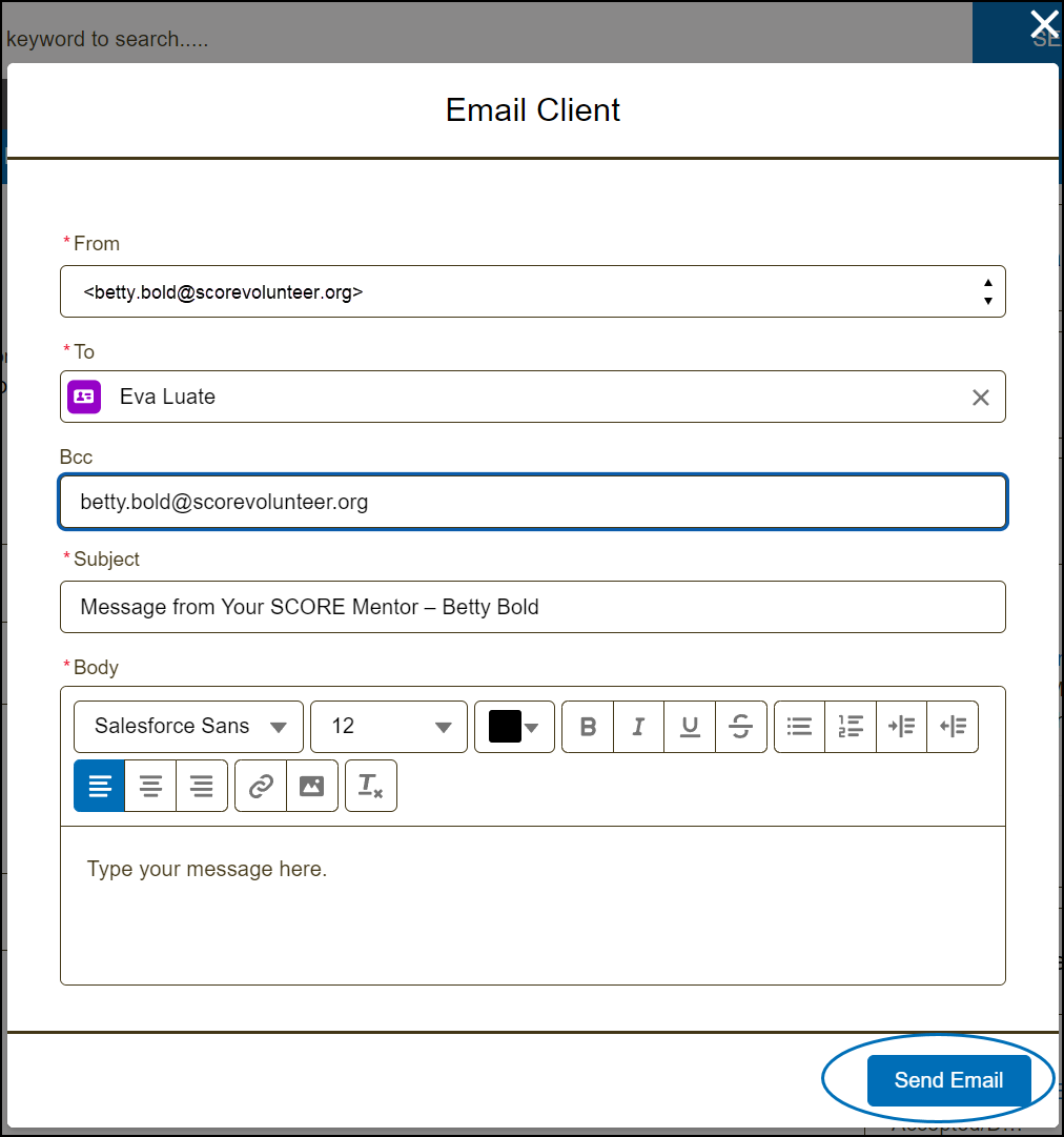 4) To receive a copy of your email, manually enter your SVO (@scorevolunteer.org) in the BCC field, then type your message in the body. When ready, click "Send Email". This function may not work well with attachments or images, as they might not display correctly to the recipient.