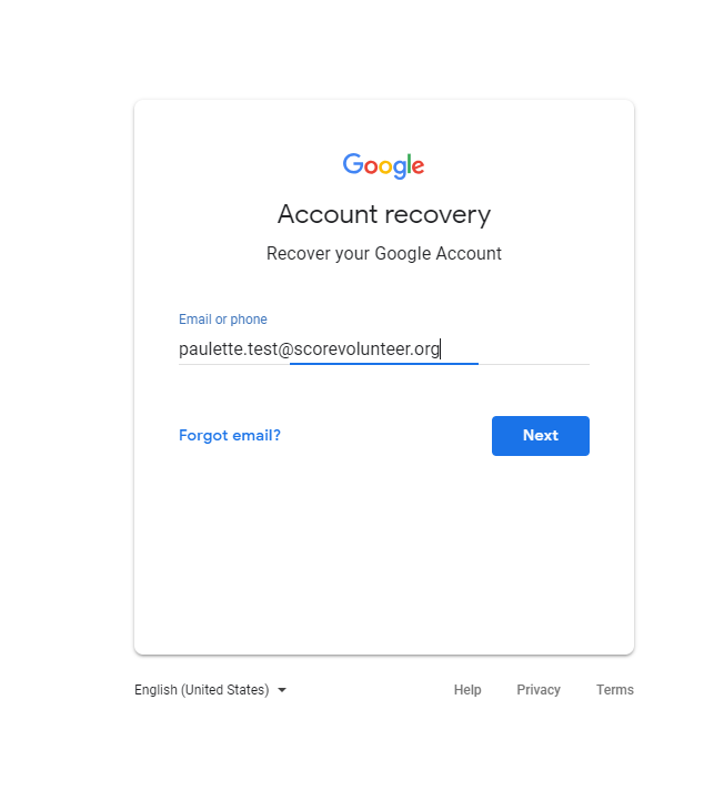 - On the Account, Recovery page enter your @scorevolunteer.org email (example: [email protected])